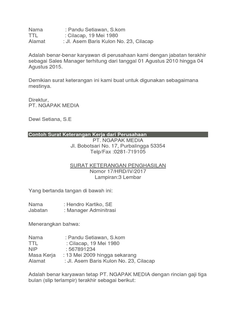 Contoh surat keterangan penghasilan kerja. Anda dapat secara langsung menemukan serta memanfaatkan surat tersebut tanpa kendala dan harus tetap menunggu pimpinan yang bisa saja saat itu sedang ada diluar kota. Sedang mencari contoh surat keterangan kerja? Pengertian surat pengalaman kerja, unsur surat keterangan kerja umum, pegawai, pns, bahasa inggris, penghasilan sebagai guru, pernyataan diri pada contoh surat keterangan kerja, memuat berbagai keterangan selama kerja, seperti sikap saat bekerja, pengalaman kerja, profesionalitas. Contoh surat keterangan kerja adalah suatu jenis surat resmi yang dikeluarkan oleh sebuah perusahaan atau instansi tertentu yang intinya untuk menyatakan bahwa seseorang memang sedang dalam periode kerja pada perusahaan atau instansi yang bersangkutan.